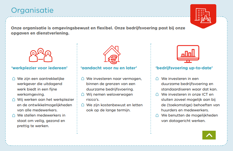 Iedere 4 jaar schrijven we een nieuw ondernemingsplan. We kijken dan terug naar de afgelopen jaren: wat hebben we bereikt en hebben we dat goed aangepakt? En we kijken vooruit: wat gebeurt er in onze omgeving, wat willen onze huurders en woningzoekenden en waar moeten we dus mee aan de slag?