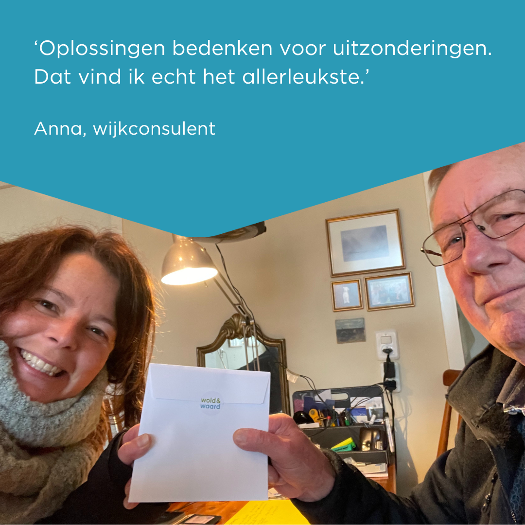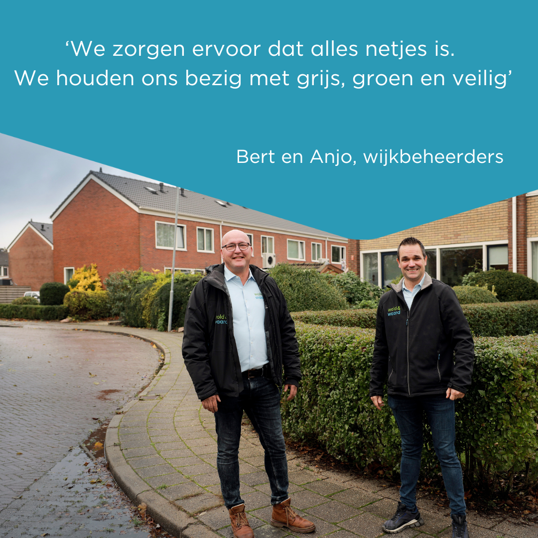 Bert en Anjo werken al jaren bij Wold & Waard. Bert begon als vakman en Anjo zat jarenlang op de bus. Ze repareerden deuren, legden dakpannen terug en verholpen lekkende kranen. Nu hebben ze een nieuwe rol als wijkbeheerders en houden ze zich bezig met 'grijs, groen en veilig'.